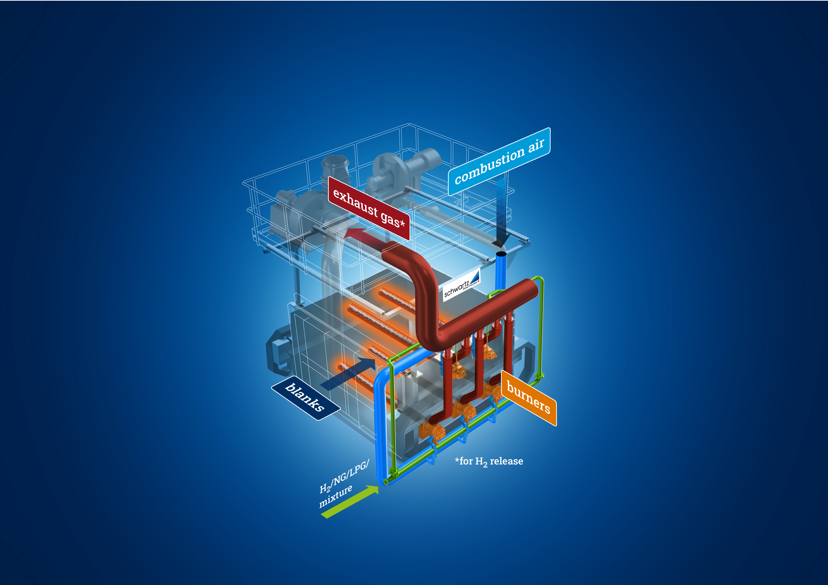 At its heart are innovative multi-fuel burners developed by our daughter Econova GmbH. These burners can run on hydrogen, natural gas and gas mixtures, combining high operational flexibility with constant power output.